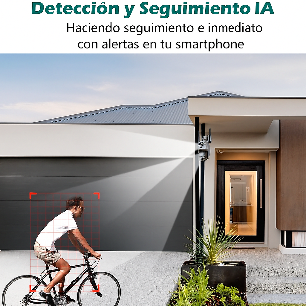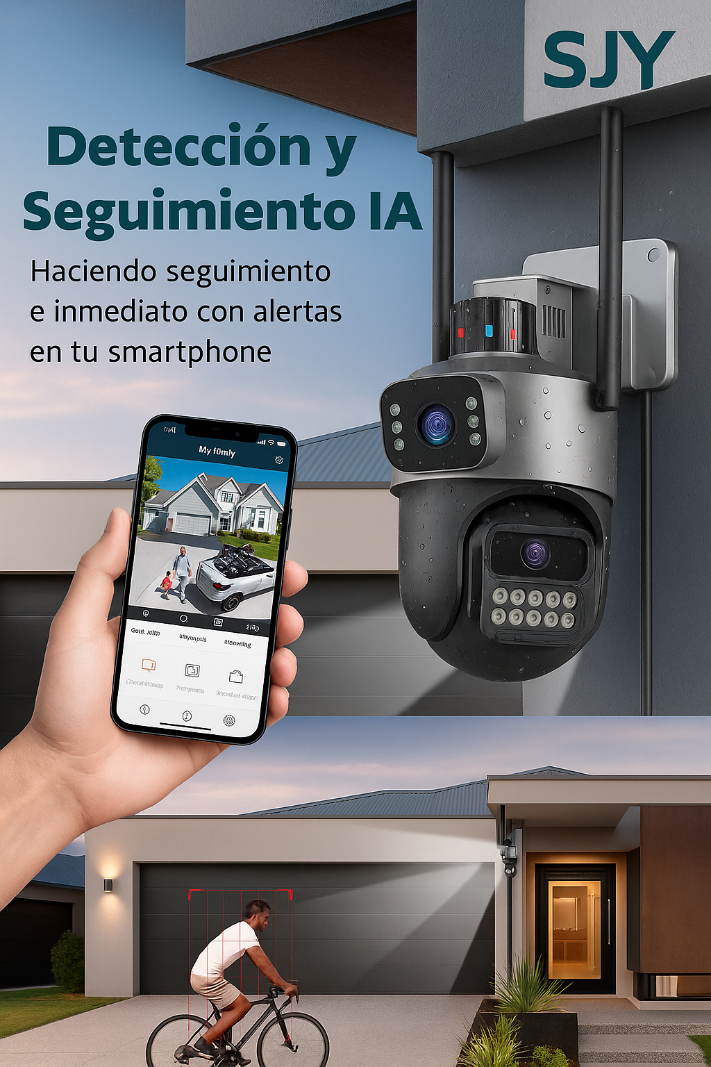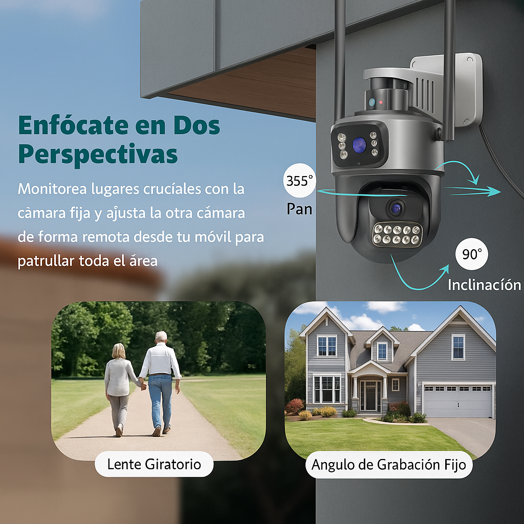 Esta potente cámara de seguridad para exteriores combina doble lente con rotación 355° horizontal y 90° vertical, inteligencia artificial para seguimiento de personas, y resolución 2K Full HD, garantizando imágenes nítidas y detección precisa en tiempo real.